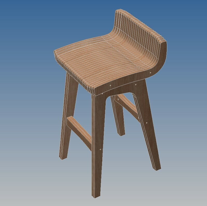Drawings/plans for the manufacture of a bar stool from plywood on a CNC machine or manually.